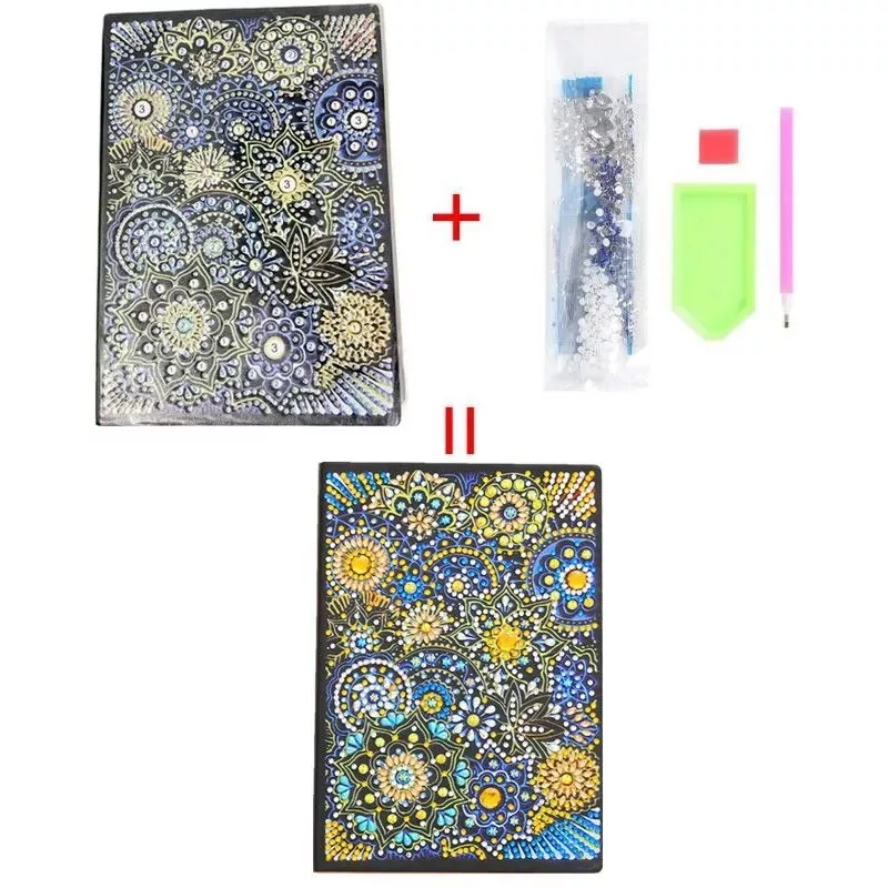 A szett tartalma: gyémántszemek, gyöngy felvételéhez szükséges toll, és a zselés anyag, jegyzetfüzet, amire a gyöngyöket rá kell tenni.