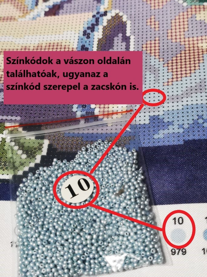 3. A gyöngyszemek színkódolva vannak, a vászon szélén látható, hogy melyik szín hányas számú zacskóban található.