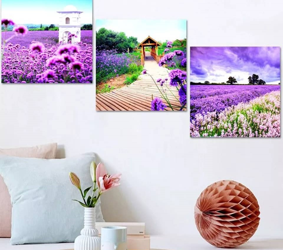 Lila mezők négyzet alakú három részes kreatív gyémánt kirakó szett, mellyel egy igazán látványos és díszes képet lehet elkészíteni, majd büszkén mutathatja meg ismerőseinek lakásának ezen kiemelkedő díszét amit Ön, saját maga készített el.